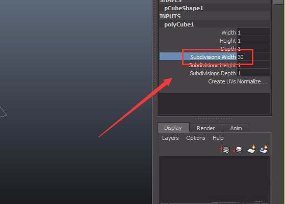 5、选择常见的这个cube物体,设置subdivision width的值为30,如图所示: