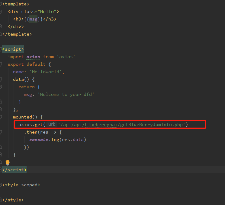 三、然后在发送ajax请求的地方做如下操作,使用在上面文件中配置的api。api/blueberrypai/getBlueBerryJamInfo.php是我的请求路径一部分,根据自己具体需求写。然后请求就可以成功发送。