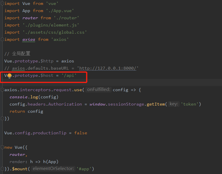 四、如果想不填写其中“/api”,也可以去main.js中配置全局配置,具体如下