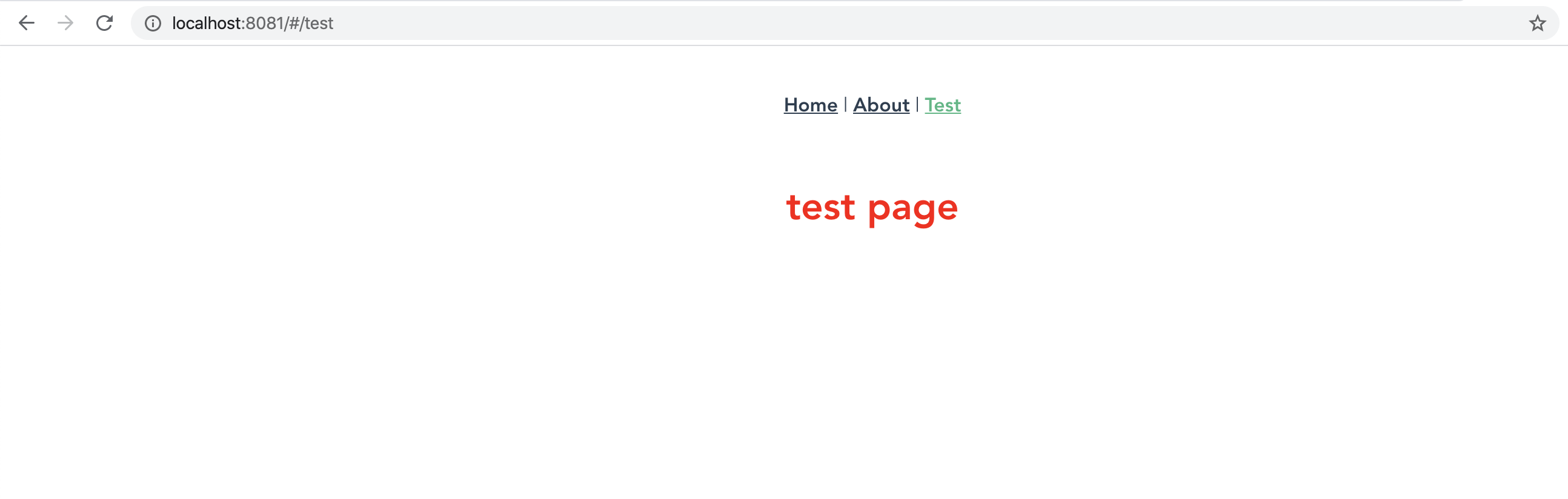 <template> <div id="app"> <div id="nav"> <router-link to="/">Home</router-link> | <router-link to="/about">About</router-link> | <router-link to="/test">Test</router-link> </div> <router-view/> </div> </template>