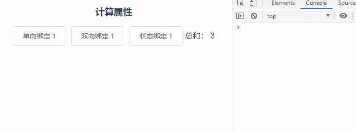 引入computed方法,返回计算后的值,这里接着使用上面的例子,用total计算上面3个数的总和。