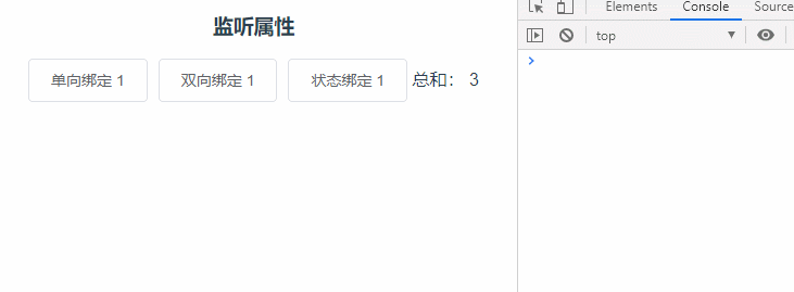 - 单向绑定,听名字就可以知道它并不具有双向绑定的特性或功能,它只会在视图初始化时绑定一次,这个变量即使后面发生了改变,视图也不会更新。可以从控制台看到singleVal 的值的确发生了变化,但界面中始终显示的为1。变量声明的方法和我们平时声明一个变量一样,如:let singleVal = 1,最后在return中返回。