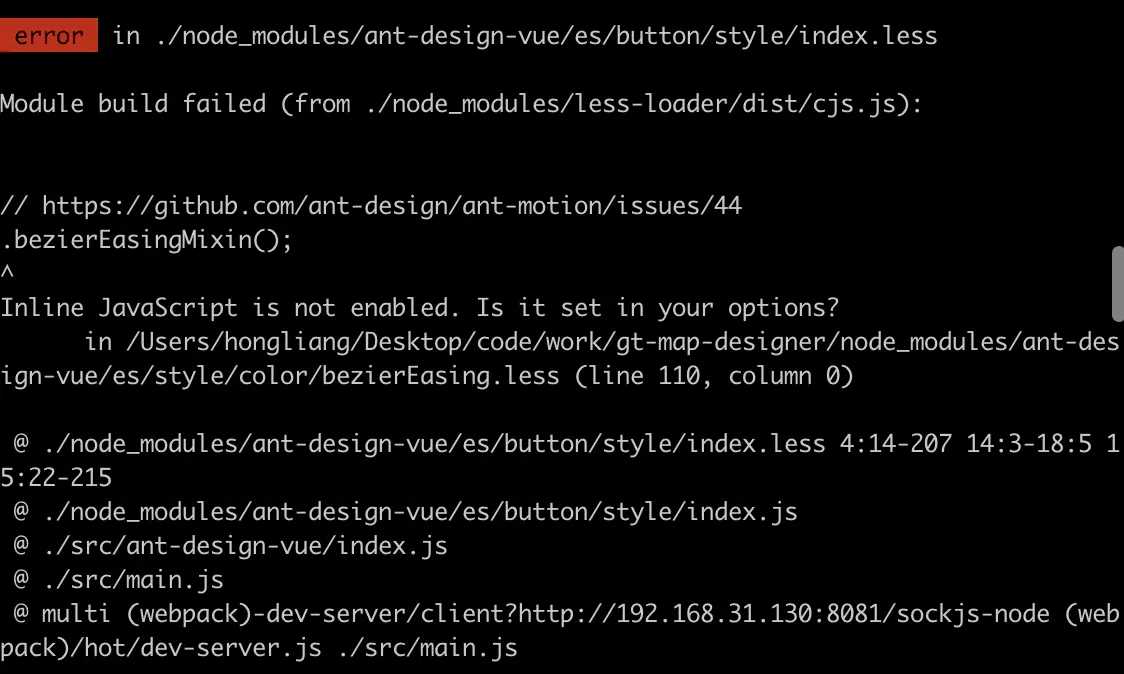 ant-design-vue使用less预处理器。在less3.0版本以前,javascriptEnabled属性默认为true,3.0以后默认为false。地址