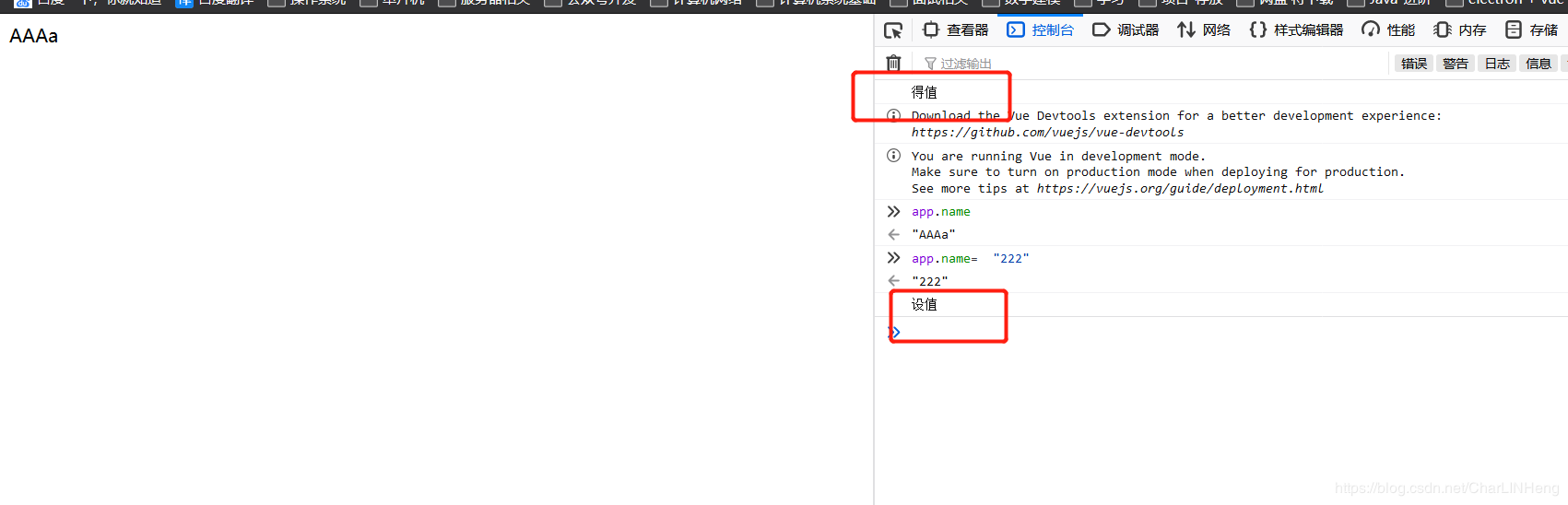 可以知道,在计算属性对象中,里面定义一个name,通过定义name的set和get方法来对其值进行设置和获取,name获得get函数return的值,name通过set函数进行设置其值,或者说改变他的值。从运行图可以看到,当页面加载的时候,当我用到name的变量的时候,他会默认执行get方法,当我在控制台中改变其值,他会默认执行set方法。