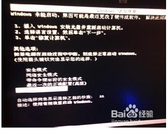 大致意思是:Windows启动失败。这种情况可能由于您最近的硬件或软件的改动导致,想要修复此问题,请进行下述操作
