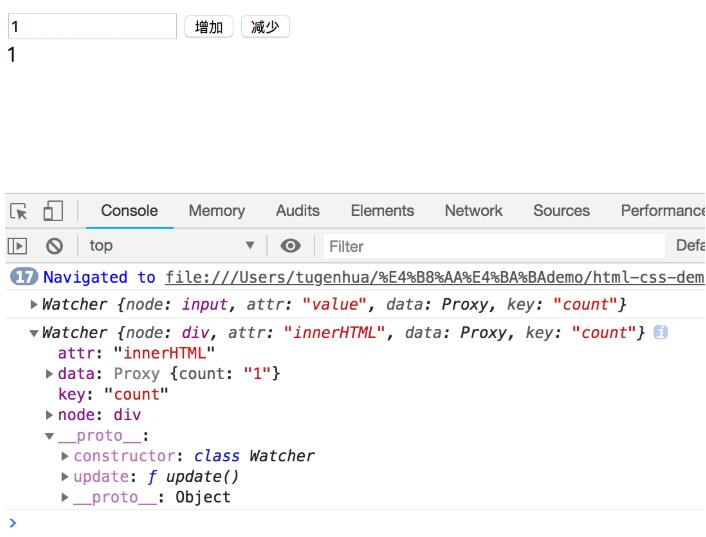 如上代码先判断该node是否有该属性,然后获取该属性的值,比如html页面中有 @click="add" 和 @click="reduce" 这样的,当点击的时候,也会调用 this.methods[methodName].bind(data)中对应vue实列中对应的函数的。因此也会执行函数的,其中data就是this.data,监听该对象的值发生改变的话,同样会调用 Proxy中的set函数,最后也是一样执行函数去更新视图的。如上就是使用proxy实现数据双向绑定的基本原理的。