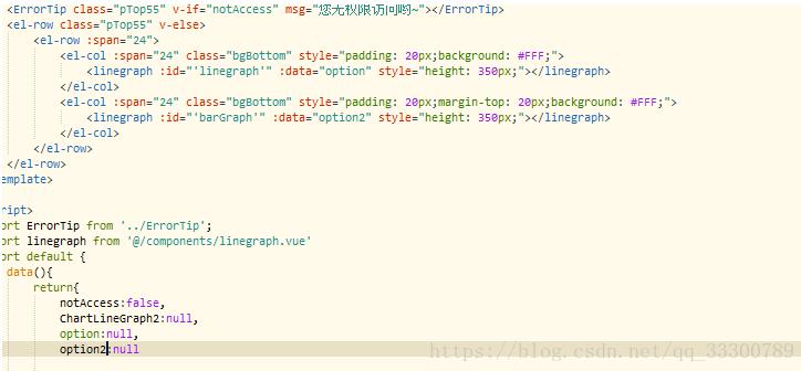 这是父组件代码,两个图表不管是折线图还是柱状图都是使用 linegraph.vue这个子组件来进行的,因为我把echarts图表生成的配置项都放在了父组件里面,然后通过父组件给子组件传值实现图表生成,