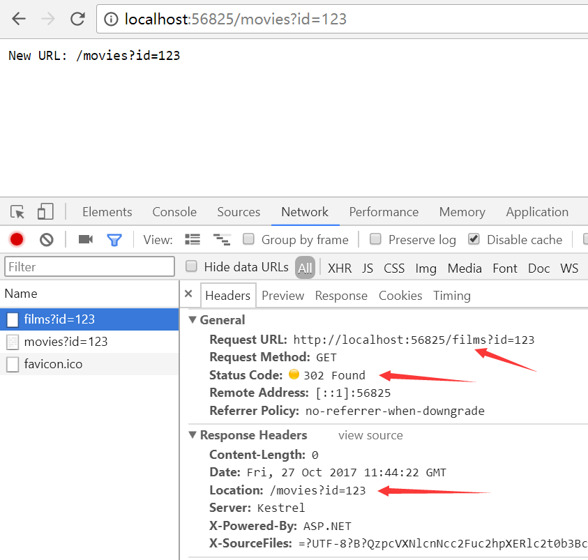 运行,在地址栏输入:http://localhost:56825/films?id=123,观察重定向过程: