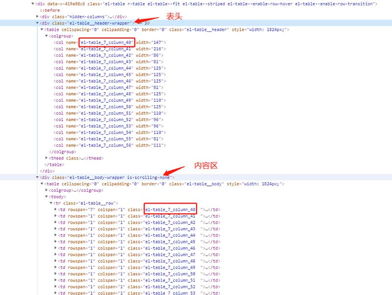 具体怎么做呢?通过查看渲染后的 DOM 元素发现,el-table 的表头和内容分别用了一个原生table,通过colgroup设置每列的宽度。就从这里入手,col的name属性值和对应的 td的class值是一致的,这样就可以遍历对应列的所有单元格,找出宽度最大的单元格,用它的内容宽度加上一个边距作为该列的宽度。