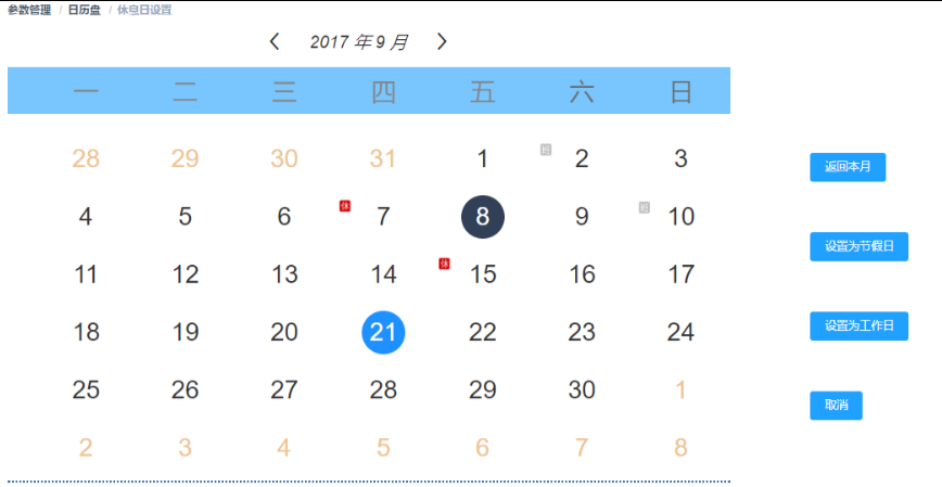 功能阐述:返回本月不多说,设置工作日和节假日是为了公司制度需要,后台会有假日表来记录。