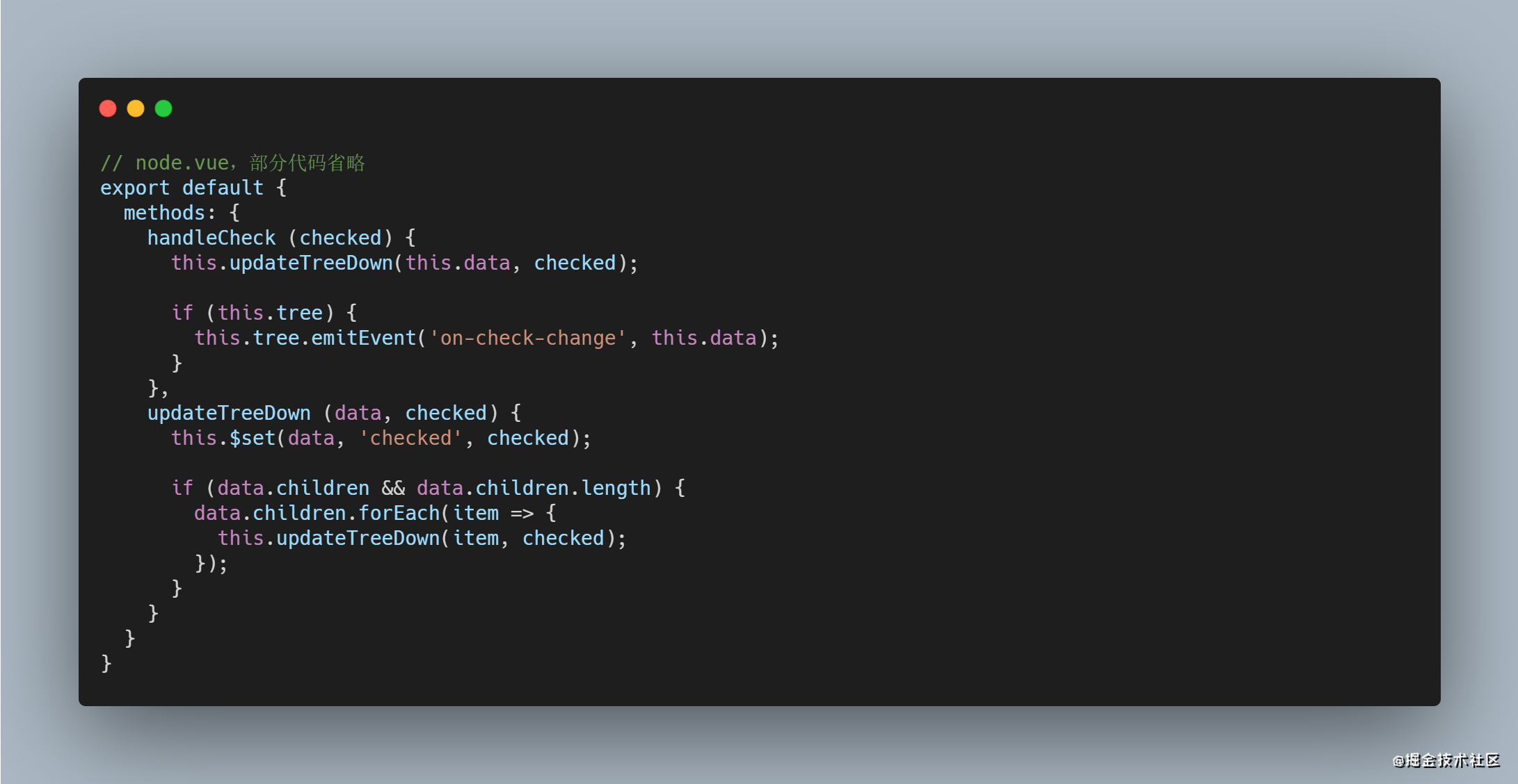 在 watch 中,监听了 data.children 的改变,并且是深度监听的。这段代码的意思是,当 data.children 中的数据的某个字段发生变化时(这里当然是指 checked 字段),也就是说它的某个子节点被选中(或反选)了,这时执行绑定的句柄 handler 中的逻辑。const checkedAll = !data.some(item => !item.checked); 也是一个巧妙的缩写,checkedAll 最终返回结果就是当前子节点是否都被选中了。