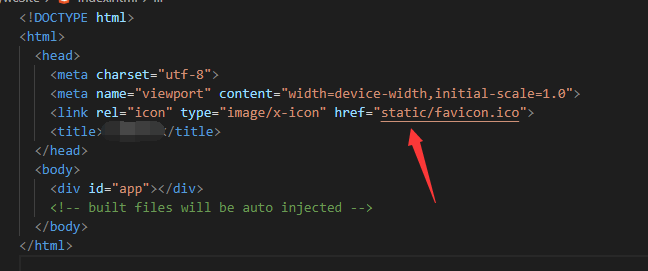 <!DOCTYPE html> <html> <head> <meta charset="utf-8"> <meta name="viewport" content="width=device-width,initial-scale=1.0"> <link rel="icon" type="image/x-icon" href="static/favicon.ico" rel="external nofollow" > <title>网站名称</title> </head> <body> <div id="app"></div> <!-- built files will be auto injected --> </body> </html>