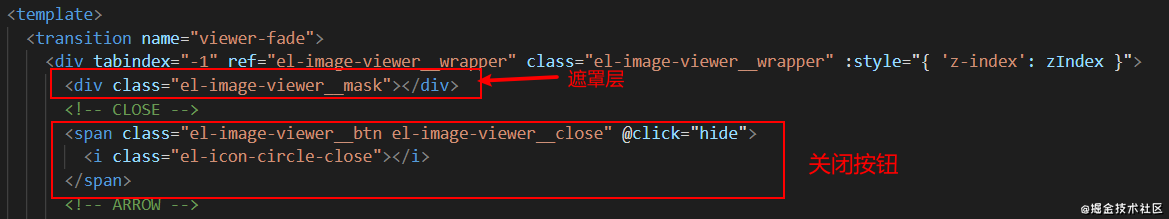 在查看image-viewer组件的源码发现,关闭按钮绑定hide方法,用于关闭预览的,但是遮罩层没有绑定任何方法,遮罩层也没有对外暴露任何方法调用,难受~