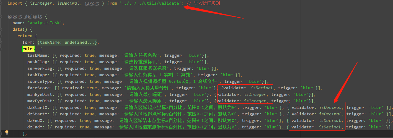 3、在页面(index.vue)中引入验证规则定义的文件,并在export default中定义rule规则,使用语法:{validator:验证方法,trigger:验证触发}