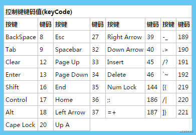 从以上例子可以看出,shift、Control、Alt 在JS中也可用“window.event.shiftKey”、“window.event.ctrlKey”、“window.event.altKey” 代替。