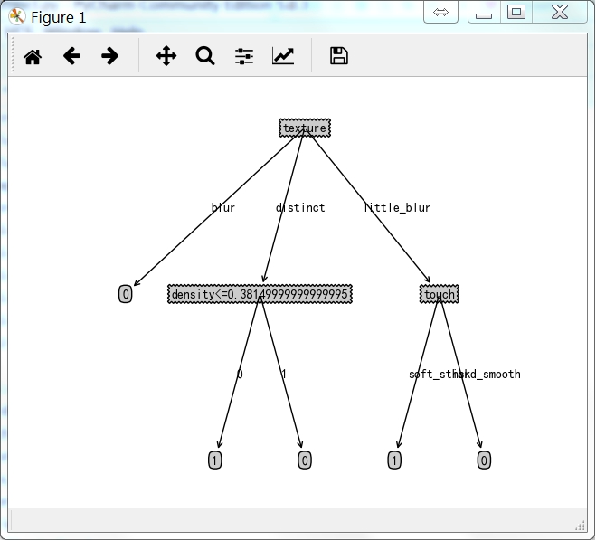 {'texture': {'blur': 0, 'little_blur': {'touch': {'soft_stick': 1, 'hard_smooth': 0}}, 'distinct': {'density<=0.38149999999999995': {0: 1, 1: 0}}}}