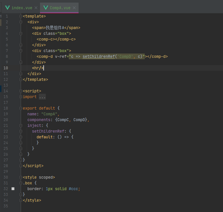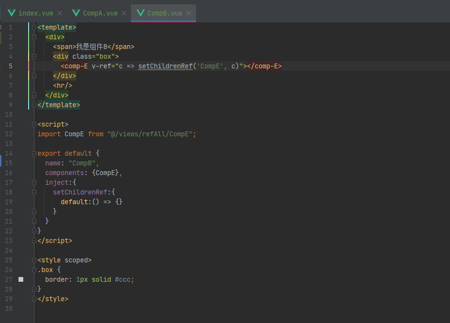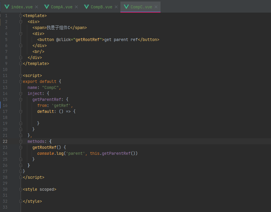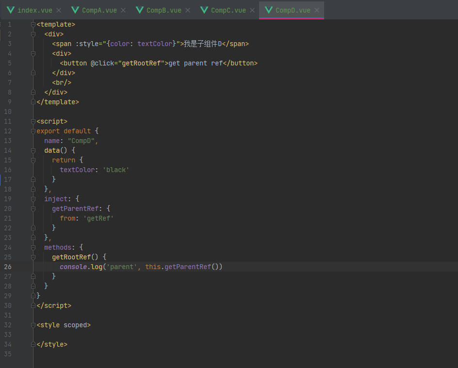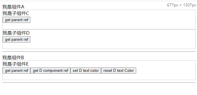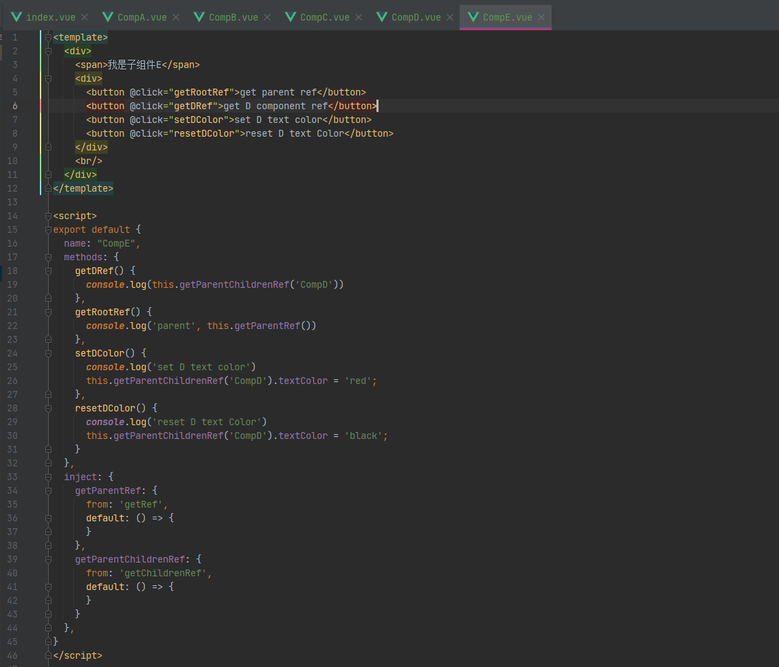 在这个页面中,我们不仅注入了两个方法,还设置了切换D组件颜色的方法,用来测试我们是否真的跨层级获取到了组件D的实例。