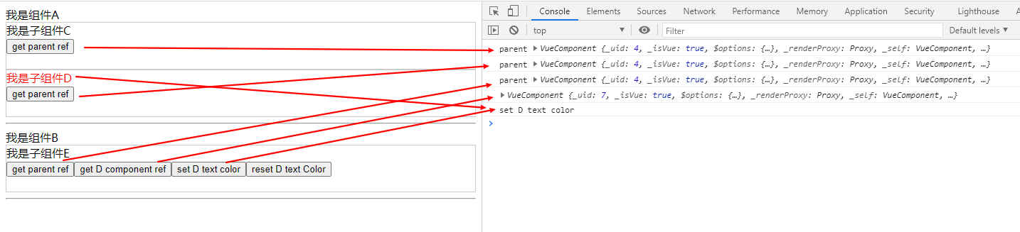 可以看到,三个parent的实例是一样的,在组件E中也成功修改了组件D的文字样式。good!