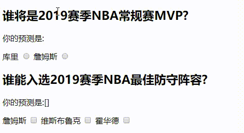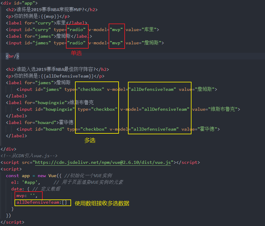 - 使用checkbox实现多选,v-model绑定的数据应该是同一个,这样多选的数据才属于同一个数组