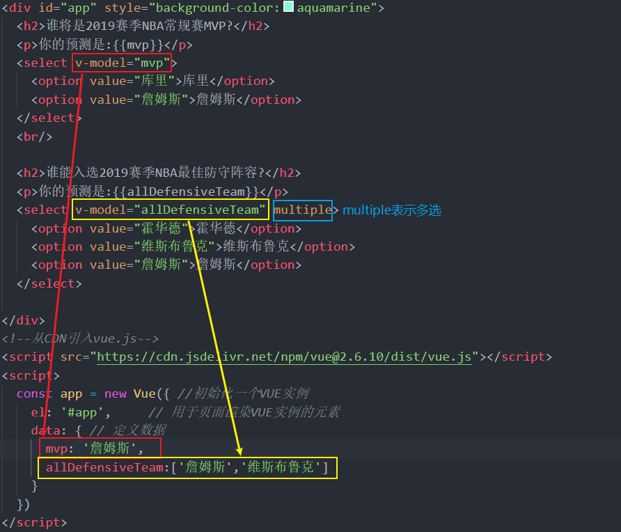 - v-model绑定模型数据allDefensiveTeam,结合multiple属性实现多选效果