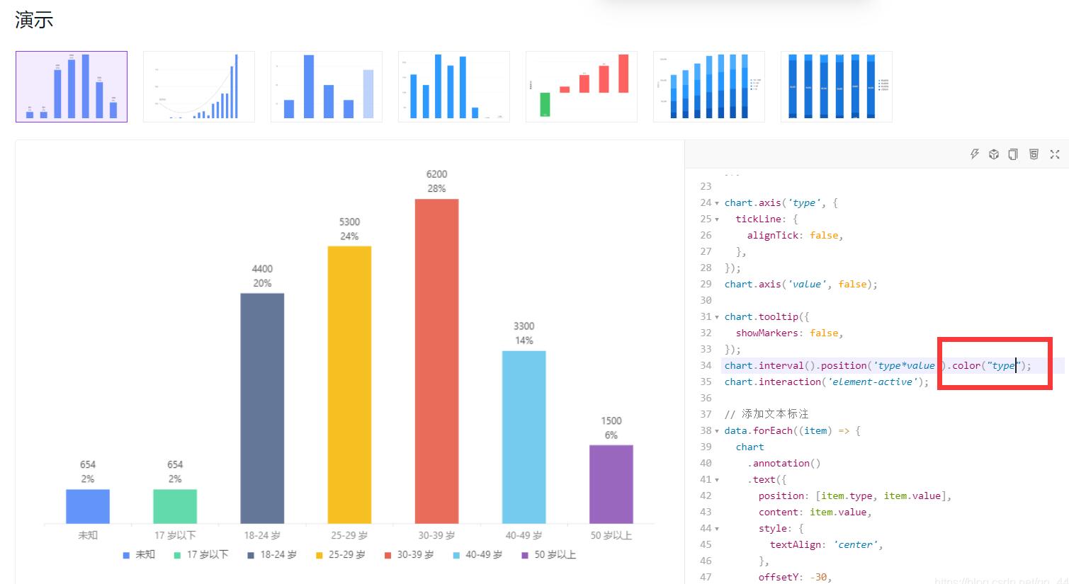右侧就是实现这个图的代码,在这里加上.color(“type”)即可根据字段名显示不同的颜色