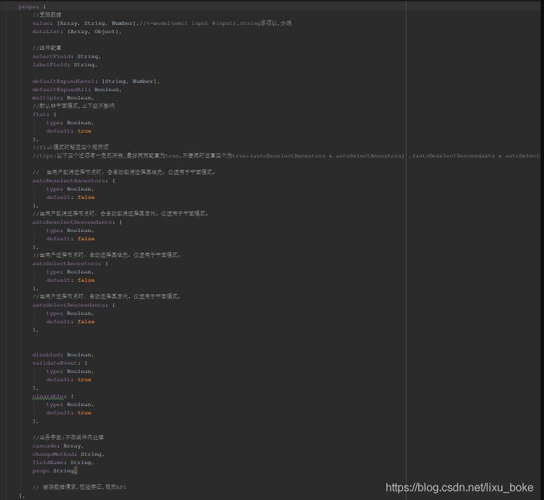 props里面可以有数据value也就是初始化的数据,dataList就是你的接口数据,接下来的就是你选择之后渲染的属性和上传的属性了,说的直白一点就是下拉中的label和value当然上面对应的就是我的labelField和selectField,之后的属性就是树形折叠属性,