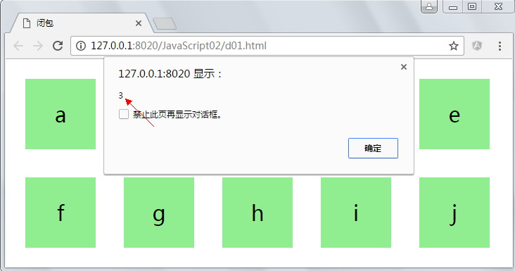 请在页面中放10个div,每个div中放入字母a-j,当点击每一个div时显示索引号,如第1个div显示0,第10个显示9;方法:找到所有的div,for循环绑定事件。