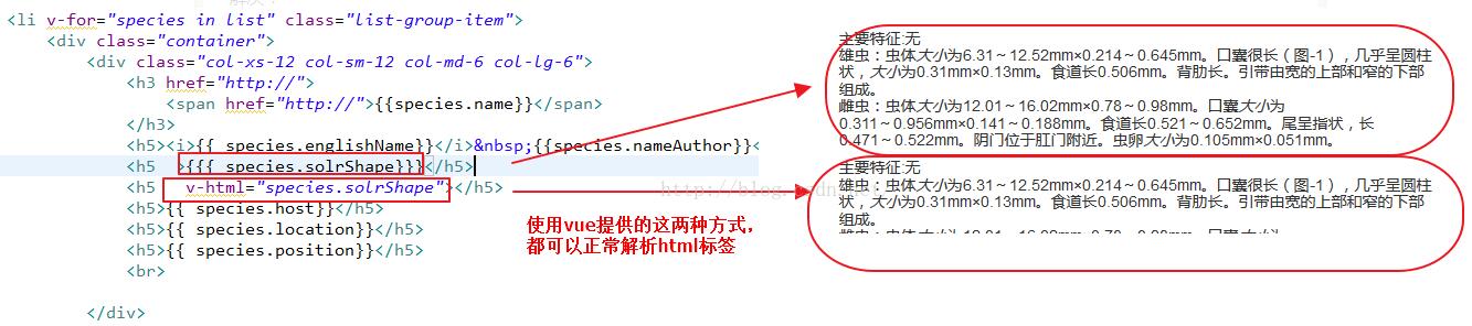此外某些情况下,使用{{{}}}符号仍然不能解析html标签,但v-htm指令却可以,可能是Vue.js存在的bug吧。