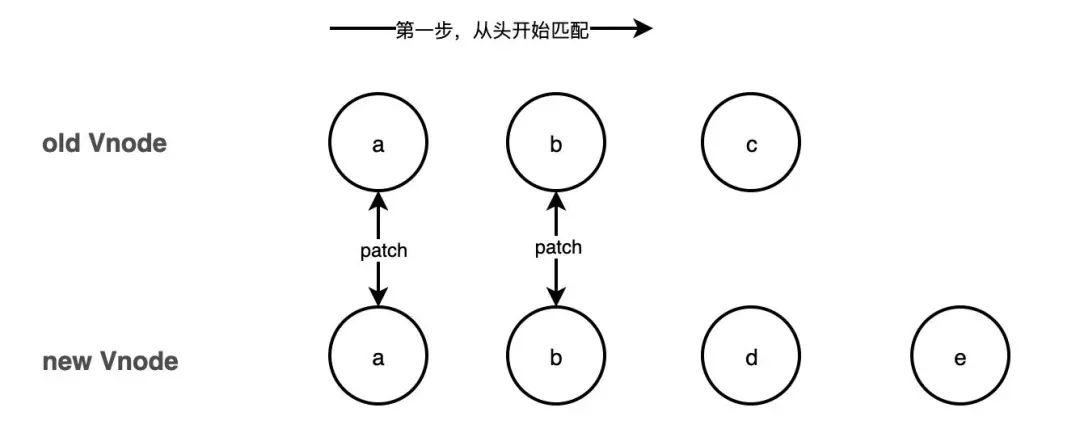 第一步的事情就是从头开始寻找相同的 vnode,然后进行 patch,如果发现不是相同的节点,那么立即跳出循环。