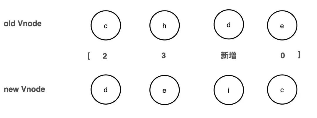 那接下来的思路是:如果能找到老节点在新节点序列中顺序不变的节点们,就知道,哪一些节点不需要移动,然后只需要把不在这里的节点插入进来就可以了。因为最后要呈现出来的顺序是新节点的顺序,移动是只要老节点移动,所以只要老节点保持最长顺序不变,通过移动个别节点,就能够跟它保持一致。 所以在此之前,先把所有节点都找到,再找对应的序列。最后其实要得到的则是这一个数组:[2, 3, 新增 , 0]。其实这就是 diff 移动的思路了