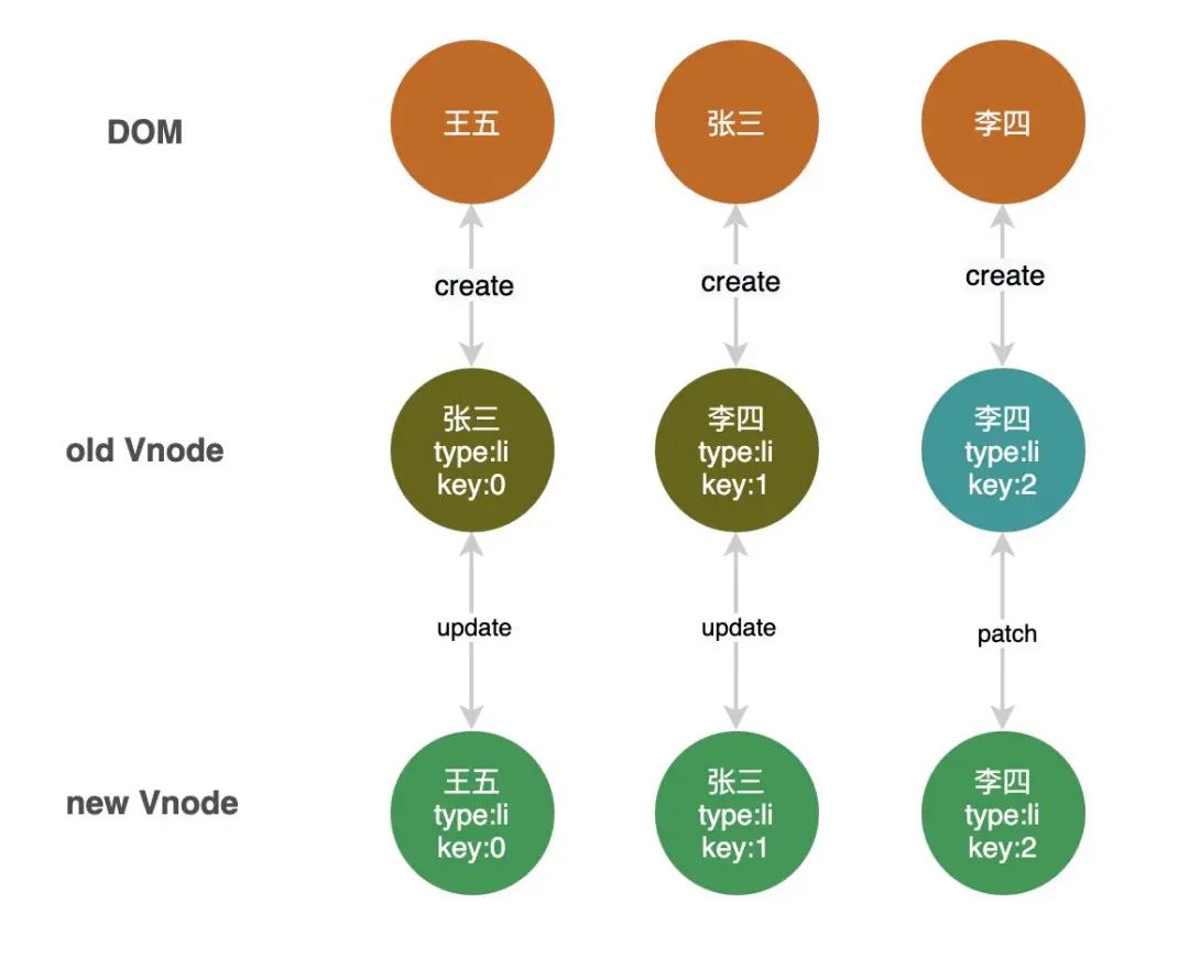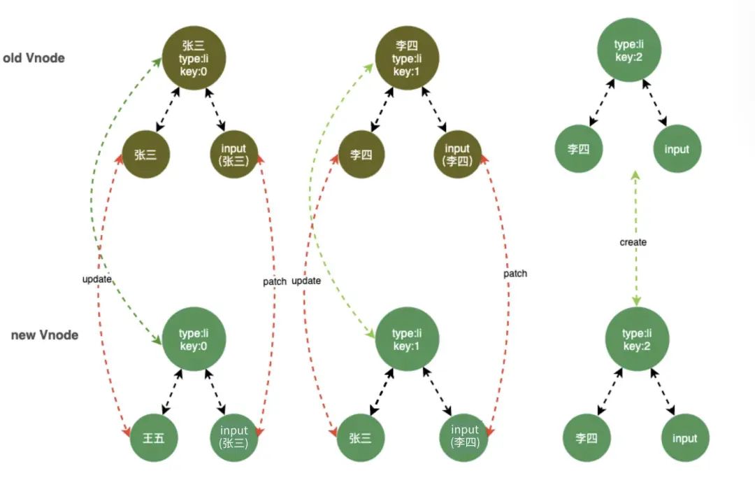 我们采用上面第一种方案作为 key 再看一下上面情况,如图所示。key 相同的节点都做到了复用。起到了diff 算法的真正作用。