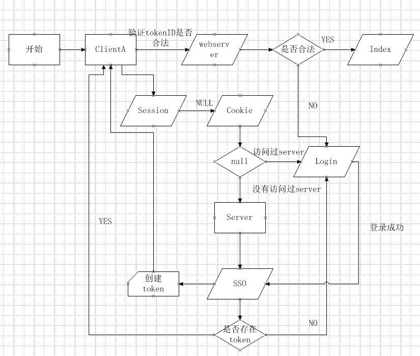 在这里我将引入第三者,s.sss.com这个站点,就是某个浏览器同时打开了这3个站点,我们访问A站点,先判断自身是否登录,如果session为空,就重定向到S站点,判断S站点上面是否有cookie,如果S站点上面也没有cookie,则由S站点重定向到A站点的登录页.这样我们就实现了第一步,S站做的的就是隐藏在幕后,子站先判断自己是否存在session,如果不存在,就重定向到主站S上面去验证.第二步,验证登录信息合法性.这里我引入token(令牌),网上有很多资料,描述token的传递,工作方式是这样,A登录成功,保存自身的session,重定向到S,S在自己站点保存一个session跟cookie,session保存token对象{tokenID,userName,startTime,endTime},cookie保存tokenID,tokenID是一个Guid,把token对象缓存在集合里面,另起一个线程,根据endTime(过期时间)来定期清理集合列表,重定向到A的时候再将tokenID传递过去,拿到tokenID后,进入验证环节,S站有提供一个接口,根据tokenID获取token对象,如果获取到对象,且没有失效,则tokenID合法,跳入index页面.情况2,A登录,直接打开B,这时候B自身没有session,会主动请求主站,主站会返回cookieID(S站存在客户端的cookie),这个时候再走验证环节,如果通过,则B根据token对象创建自身的session,再跳入index.在这里整个单点登录就已经成功了,接下来附上流程图: