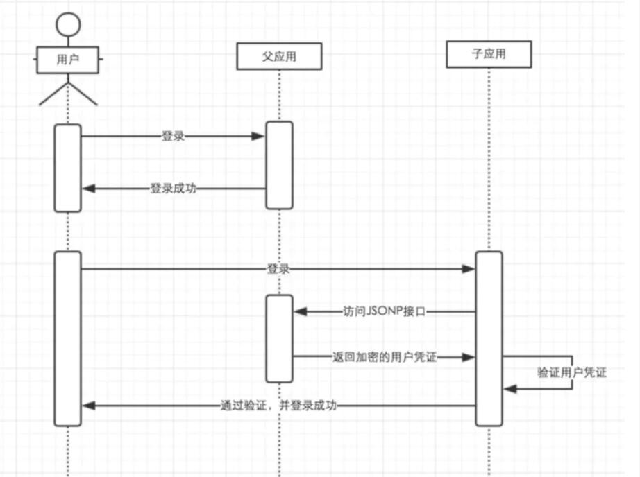用户在父应用中登录后,跟Session匹配的Cookie会存到客户端中,当用户需要登录子应用的时候,授权应用访问父应用提供的JSONP接口,并在请求中带上父应用域名下的Cookie,父应用接收到请求,验证用户的登录状态,返回加密的信息,子应用通过解析返回来的加密信息来验证用户,如果通过验证则登录用户。