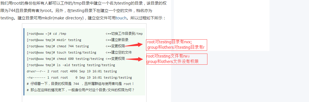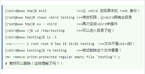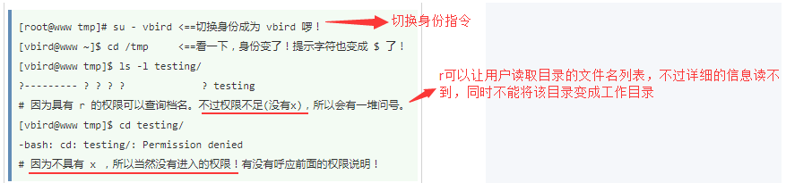 注意:要开发目录给任何人浏览时,应该至少要给予r和x权限,w不可以随便给;x在目录中与能否进入该目录有关