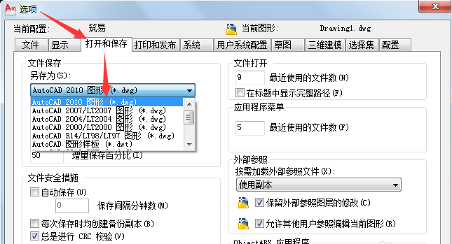 也可以OPtions命令打开【选项】窗口,在【打开和保存】选项卡中,在【另存为】中设置默认保存的dwg版本。
