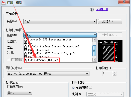 Ctrl+P或plot命令打开【打印】窗口,在【打印机/绘图仪】中选择“PublishToWeb JPG.pc3”,然后选择图形区域打印。