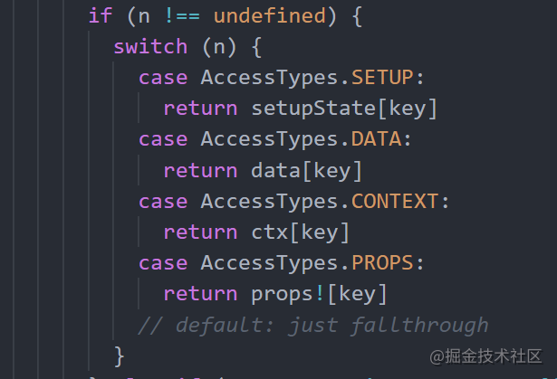 当然也可以在源码中的packagesruntime-coresrccomponentPublicInstance.ts看到,通过switch先判断setup中的变量是否存在,然后再去判断data中的变量。所以setup中变量的优先级会高于data中的变量。