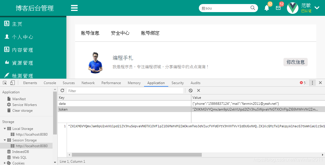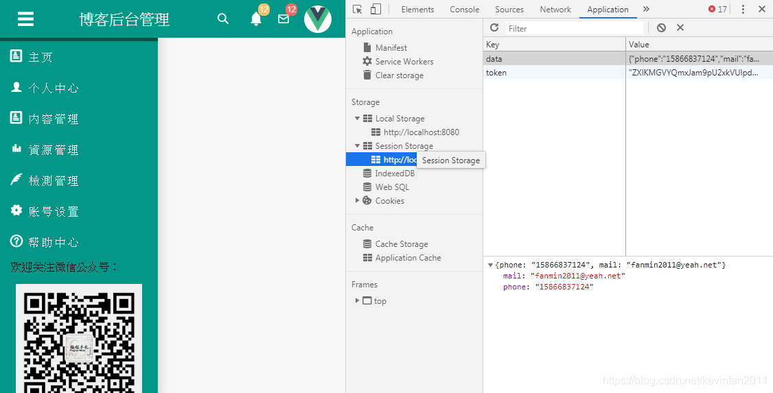 这里我用 localStorage和sessionStorage分别存了两个数据,localStorage是自定义的,sessionStorage是从后台获取的,打开浏览器开发者工具,在Application中我们可以在Storage下面的localStorage和sessionStorage分别找到我们存储的对应值。