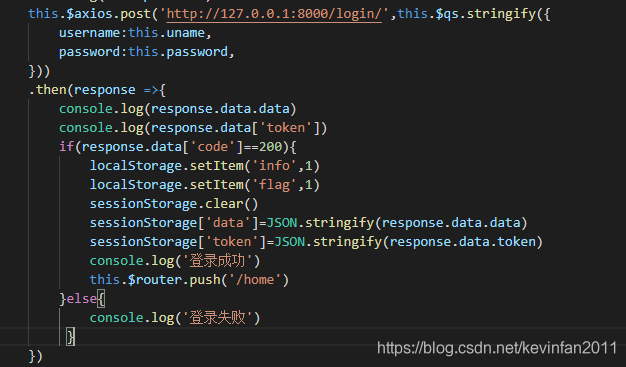 下面是我实际开发中的应用,前面我通过JsonResponse向前端发送了JSON数据,里面包含了data(用户请求的数据)、token(服务器生成的token)和code(后台处理的状态码),前端收到这些数据后对数据进行处理,判断code返回是否成功,如果成功我们就解析数据并将数据存入本地,否则则访问失败。