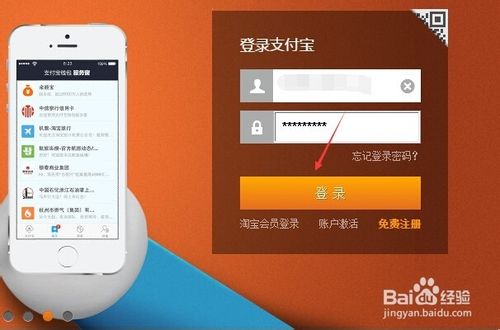 在打开的支付宝官方首页上,输入支付宝帐号和密码,然后点击登录,如下图所示。