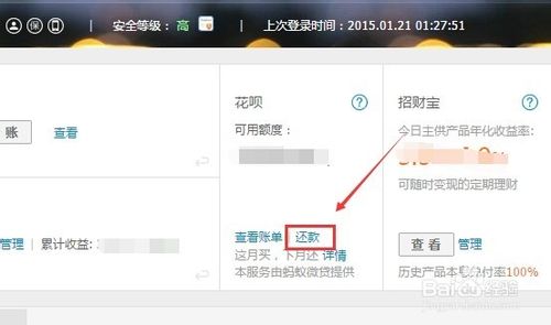 成功登录支付宝后,在支付宝个人中心首页上,我们可以看到支付宝花呗,要想关闭支付宝花呗,我们先点击支付宝花呗还款,如下图所示。
