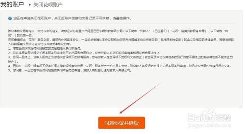 接着就到了关闭花呗账户协议界面,这里说明了关闭花呗的注意点,看完后,点击同意协议并继续,如下图所示。