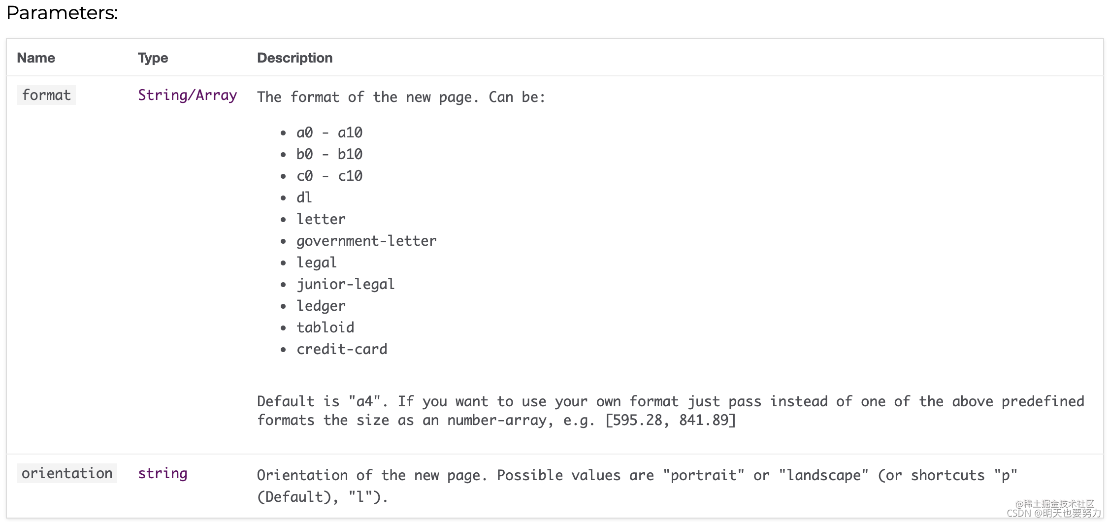 第三个参数:可以是下面格式,默认为“a4”。如需自定义格式,只需将大小作为数字数组传递,如:[592.28, 841.89];