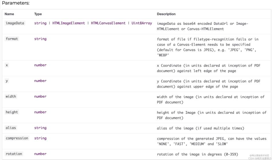 pdf.addImage() 将图像添加到PDF。参数如下: