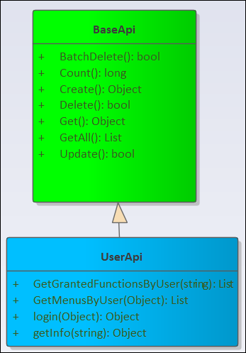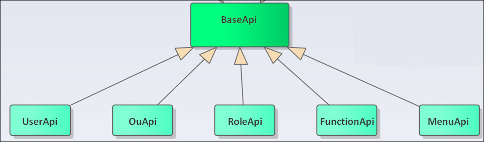 权限模块我们涉及到的用户管理、机构管理、角色管理、菜单管理、功能管理、审计日志、登录日志等业务类,那么这些类继承BaseApi,就会具有相关的接口了,如下所示继承关系。