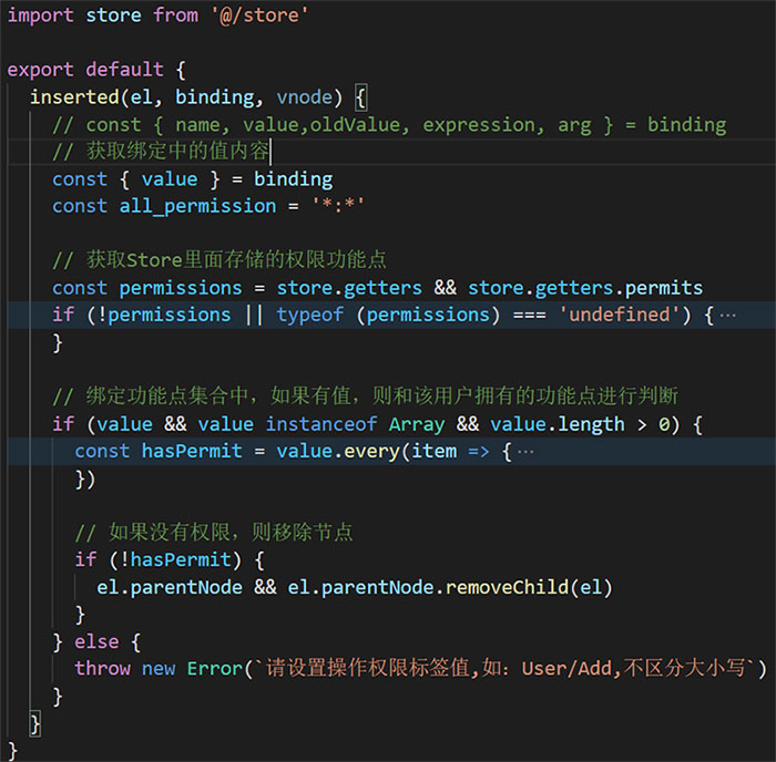 我们在directive目录中定义一个permit.js的自定义指令文件,用来进行相应的处理的。
