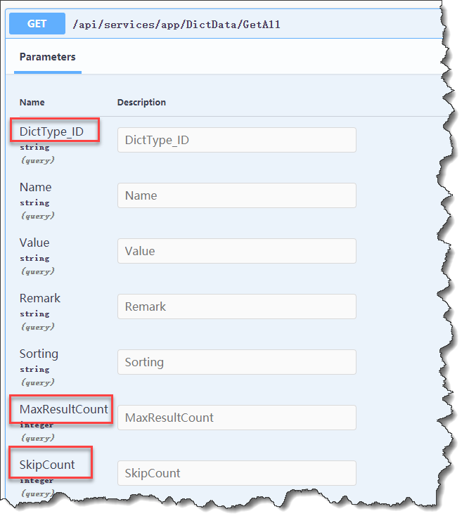 那么我们前端界面也需要根据这些参数来构造查询界面,我们可以通过部分条件进行处理即可,其中MaxResultCount和SkipCount是用于分页定位的参数。