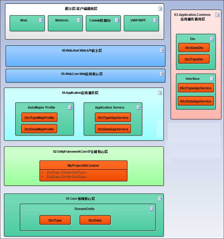 整理后的ABP快速开发框架的架构图示,如下图所示(以字典模块为例说明)