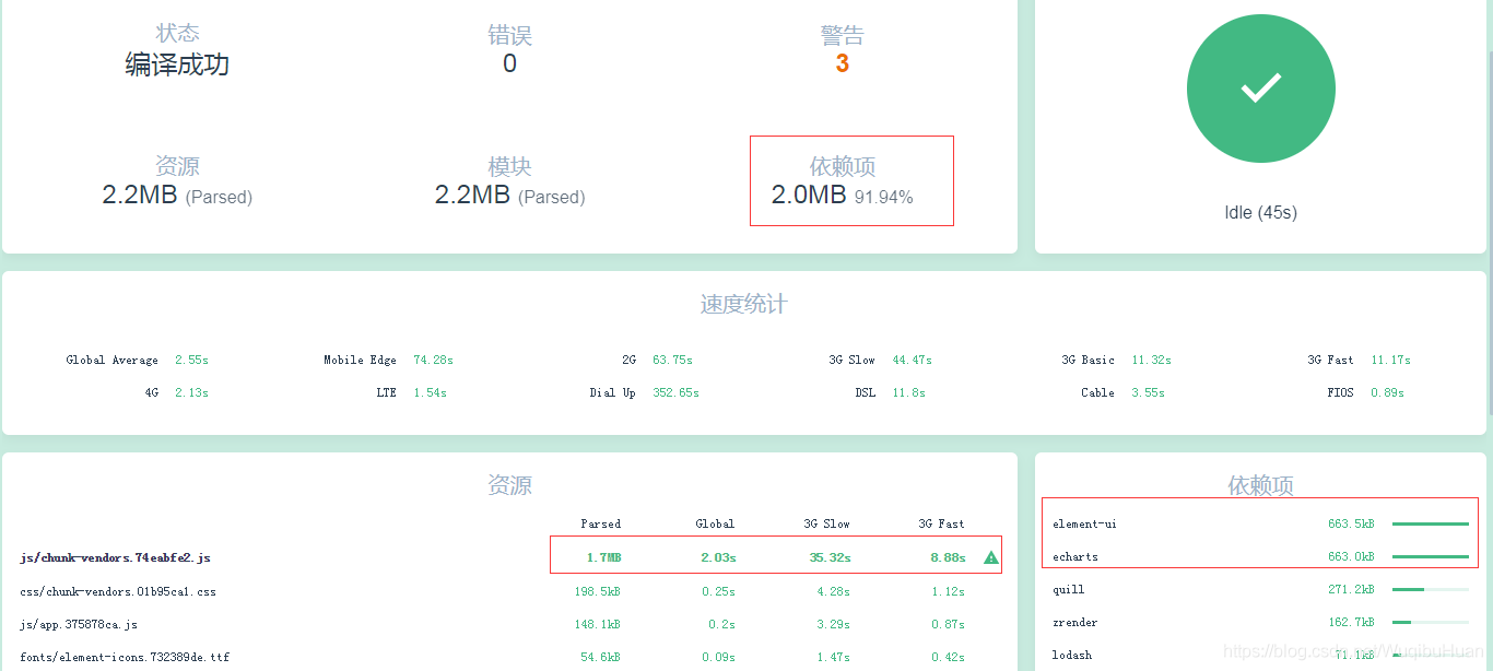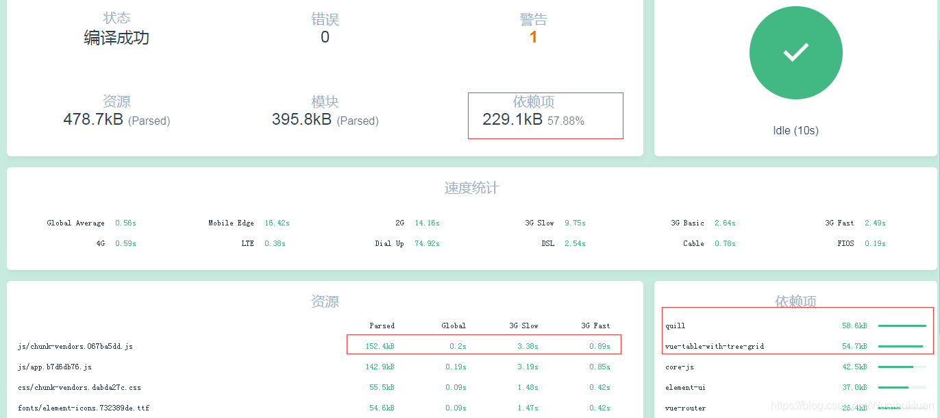 再右侧可以看到element-ui 和echarts 以及富文本编辑器,树状表格插件这几个依赖项的体积最大,接下来可以针对这些做优化