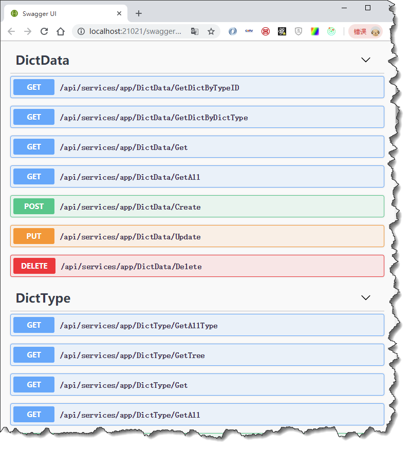 上图就是ABP后端框架的API接口的查看页面,从上图可以看到,一般业务对象,都有Get、GetAll、Create、Update、Delete等常见接口,由于这些接口是给前端进行调用的。